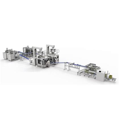 2、生產(chǎn)線配置有立式包裝機若干臺+小包整理輸送線+斗式提升機+電腦組合秤+電子稱架